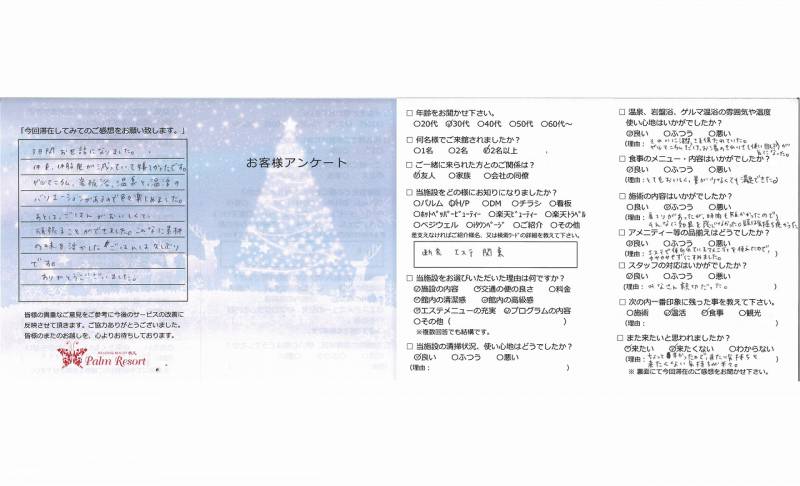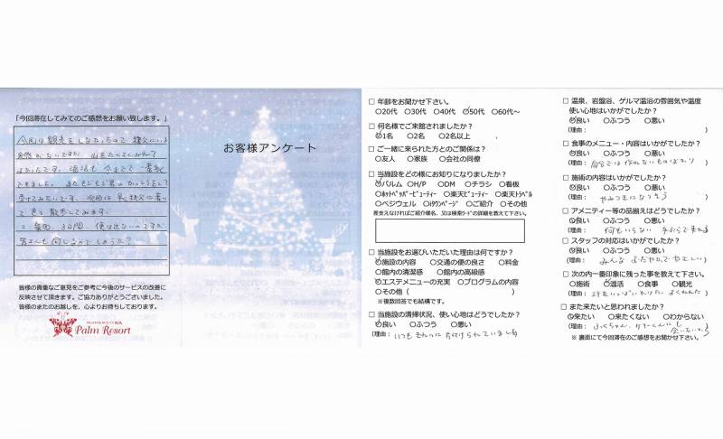 最初はとても不安でしたが、スタッフの方がいつも体調を 気にかけてくれたり、食事がとても凝っていたり、非常に 清潔な状態がキープされた館内だったので安心して楽しく すごせました。 お茶がのみほうだいなのも、とてもよかったです。 ありがとうございました。