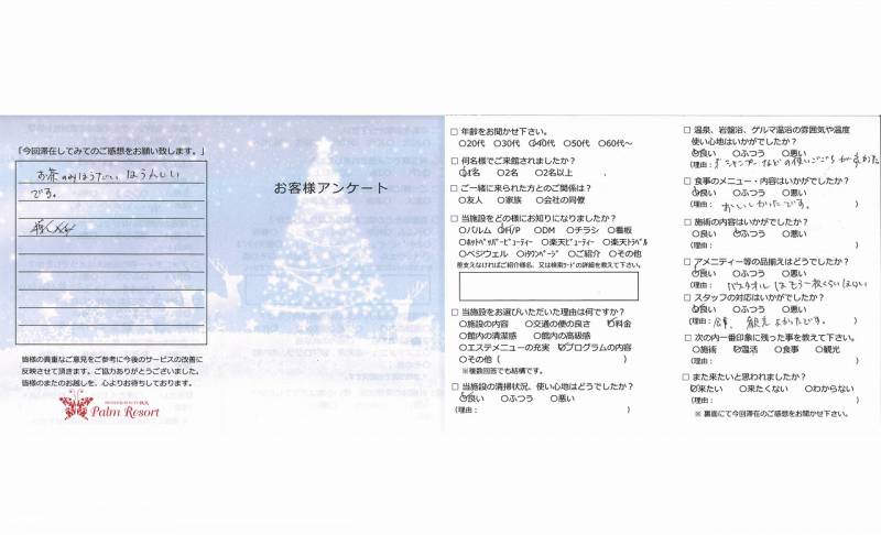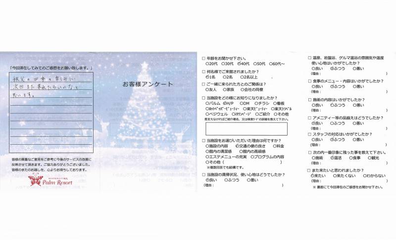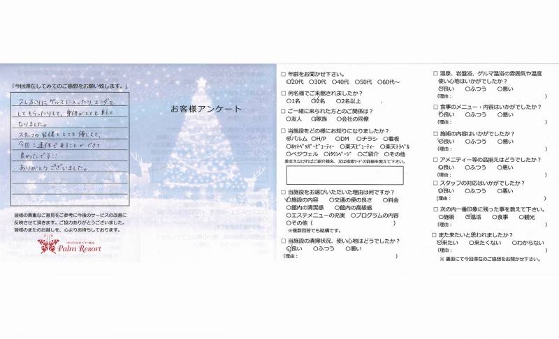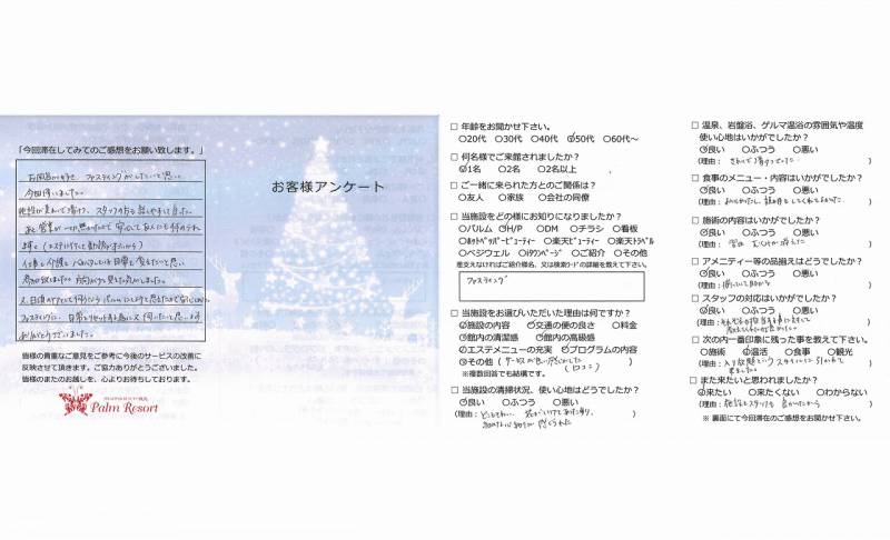 お風呂が好き、ファスティングが したいと思い今回伺いました。 施設が美れいで清けつ、スタッフ の方も話しやすくて良かった。 あと、営業が一切無かったので 安心して友人にもすすめられます。 (エステに行くと勧誘がすごいから) 仕事と介護とバタバタしている日常を 変えたいと思い参加致しました。 方向が少し見えた気がしました。 又、日頃のケアとして伺うならパルムに しようと思えたので安心しました。 ファスティングに、日常をリセット する為に又伺いたいと思います。 ありがとうございました。