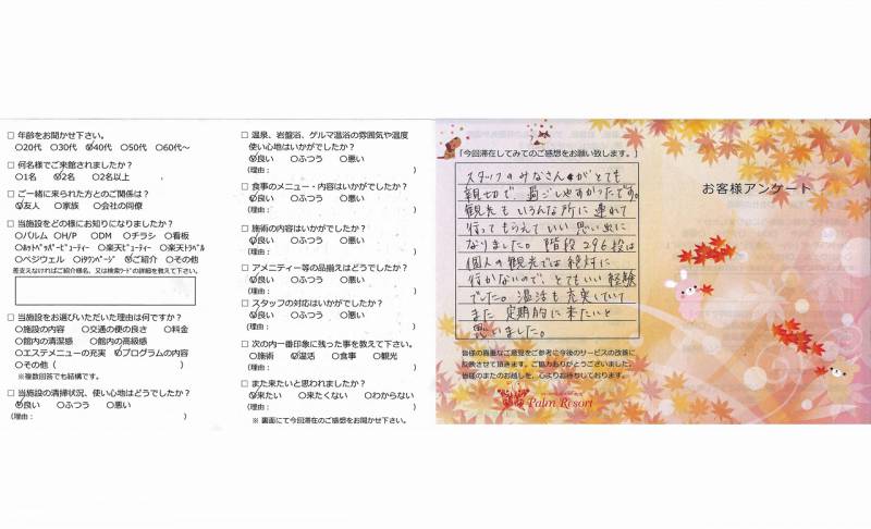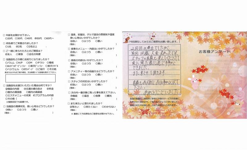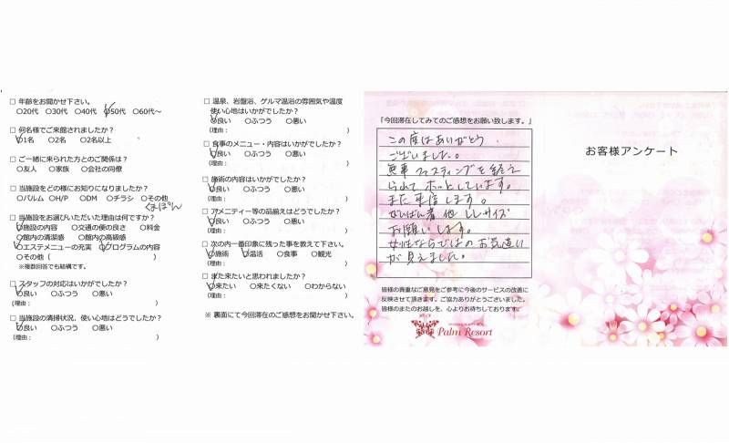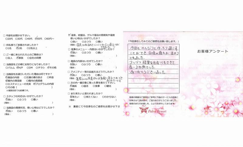 この度はありがとうございました。 無事ファスティングを終えられて ホッとしています。また来店します。 岩盤着、他 LLサイズお願いします。 女性ならではのお気遣いが見えました。