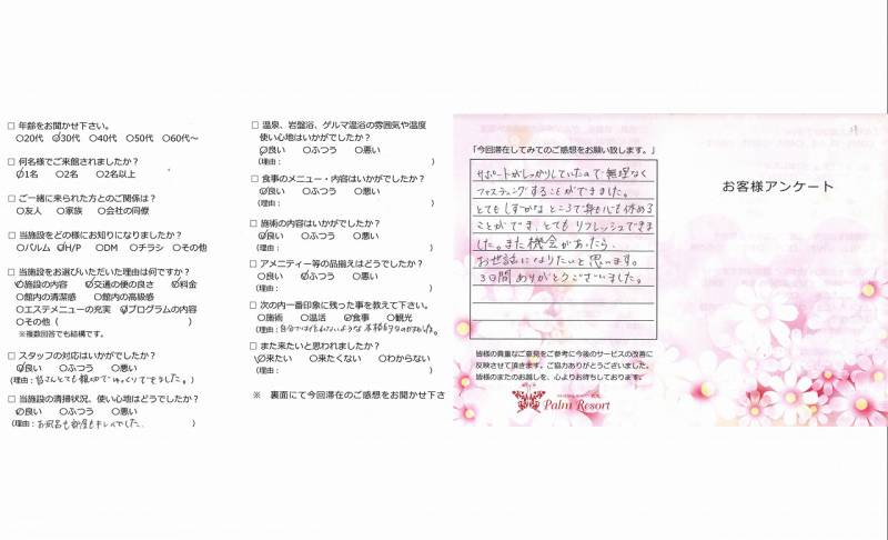 日常とは離れ、リラックスした時間を過ごせました。 運動やマッサージ、食事など、これからの日々で実践 できるようがんばります。