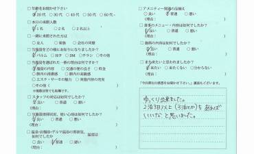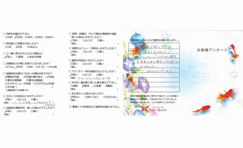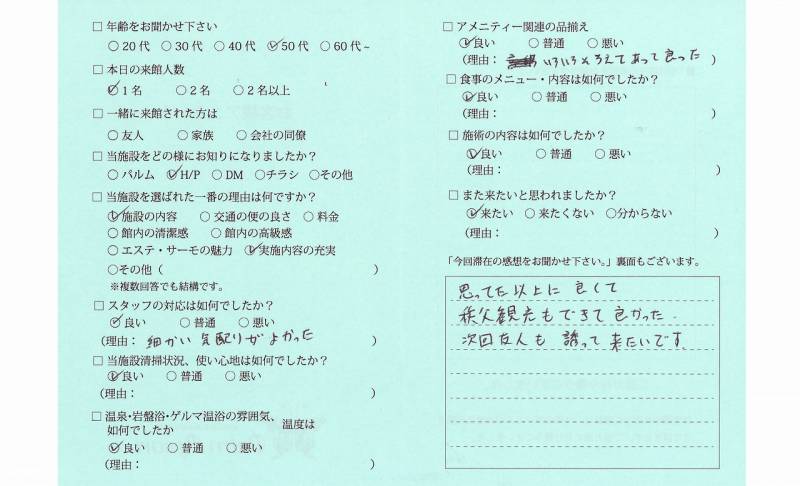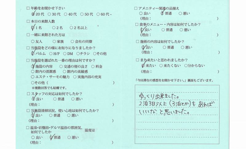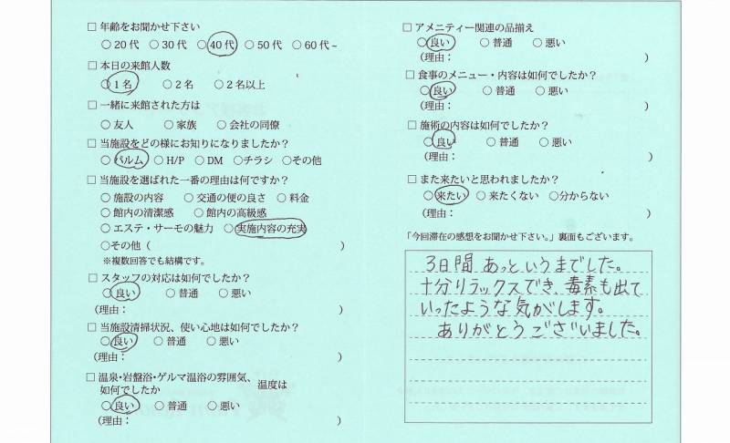 3日間あっというまでした。 十分リラックスでき、毒素も 出ていったような気がします。 ありがとうございました。