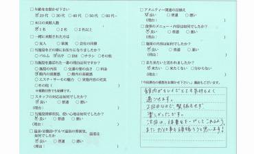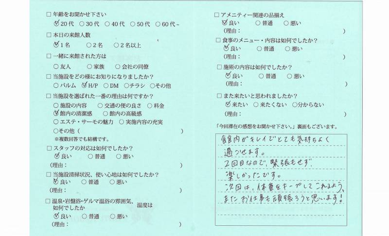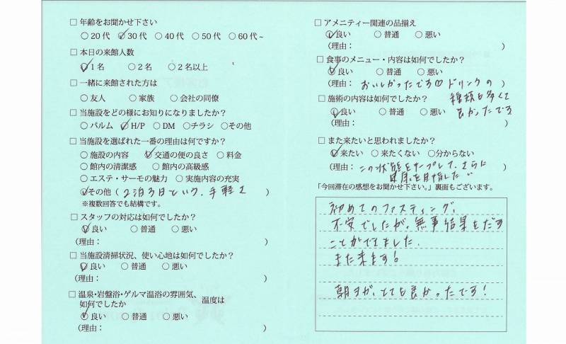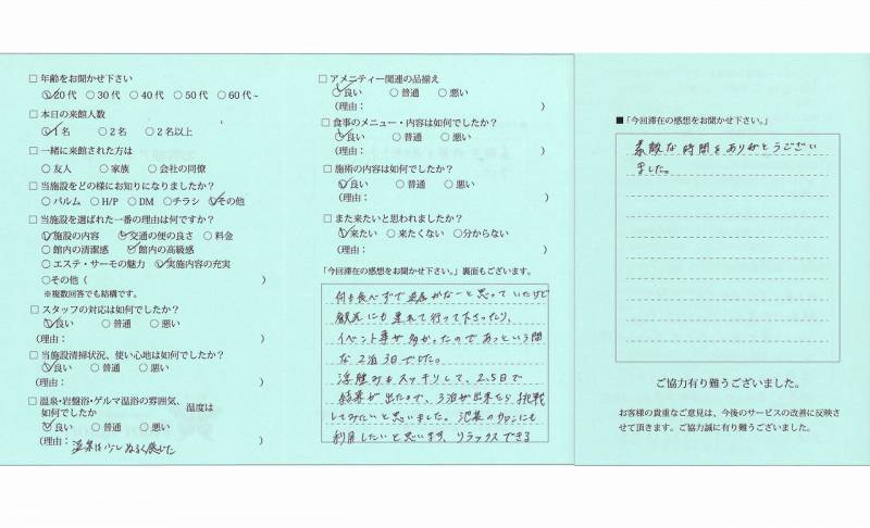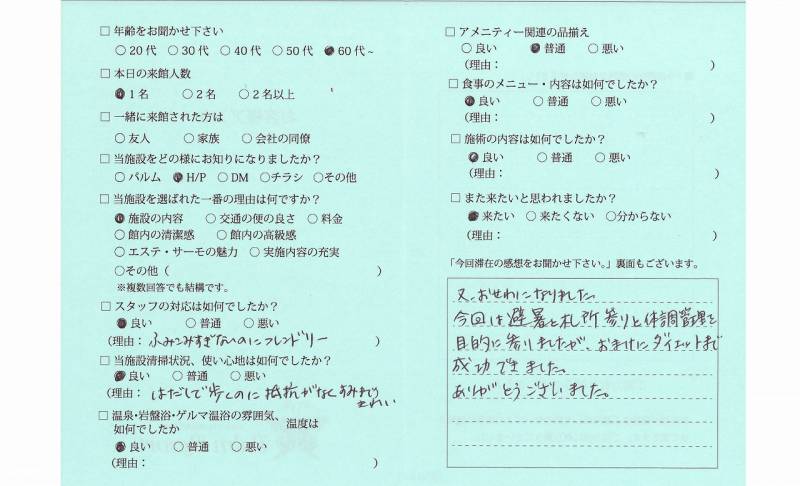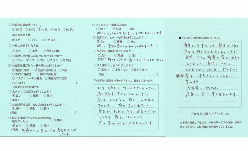 あまりお風呂が好きではないのですが(温泉) 手足のひえがすごく、少しはいいかなと思い お世話になりました。 特にゲルマ温浴は手足がまっかになり、全身の汗が したたり落ちるほどでした。 今は足がとてもあたたかいです。 真夏という事もあり、脱水がこわく水分を多くとり たかったのですが夜間、ドアの開閉の音がかなりひびく ので夜間は水分をひかえぎみにしました。 トイレまでの移動音が改善されるといいかと思います。 お世話になりました。 今度は冬に来てみたいです。