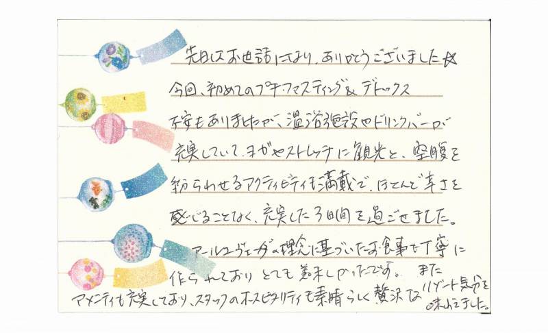 先日はお世話になり、ありがとうございました☆ 今回、初めてのプチファスティング&デットクス 不安もありましたが、温浴施設やドリンクバーが 充実していて、ヨガやストレッチに観光と、空腹を 紛らわせるアクティビティも満載で、ほとんど辛さを 感じることなく、充実した3日間を過ごせました。 アーユルヴェーダの理念に基づいたお食事も丁寧に 作られておりとても美味しかったです。 またアメニティも充実しており、スタッフのホスピタリティも素晴らしく、贅沢なリゾート気分を味わえました。