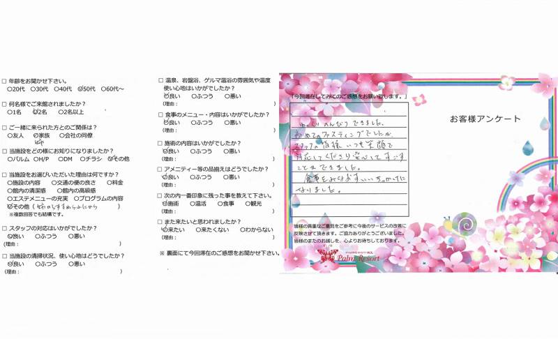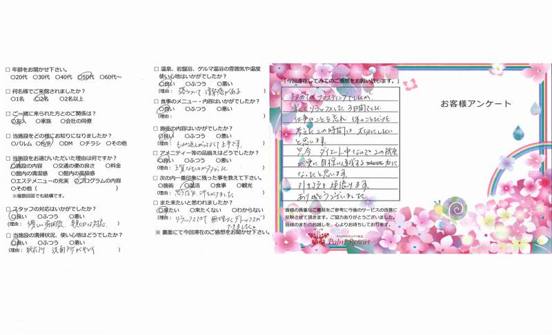 初めてのファスティングでしたが 楽しくリラックスした3日間でした。 仕事のことを忘れ、体のことだけを 考えたこの時間は大切にしたいと思います。 只今ダイエット中なのでこの機会が更に目標に 達成する力になったと思います。 引き続き頑張ります。ありがとうございました。