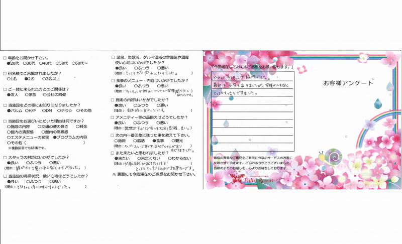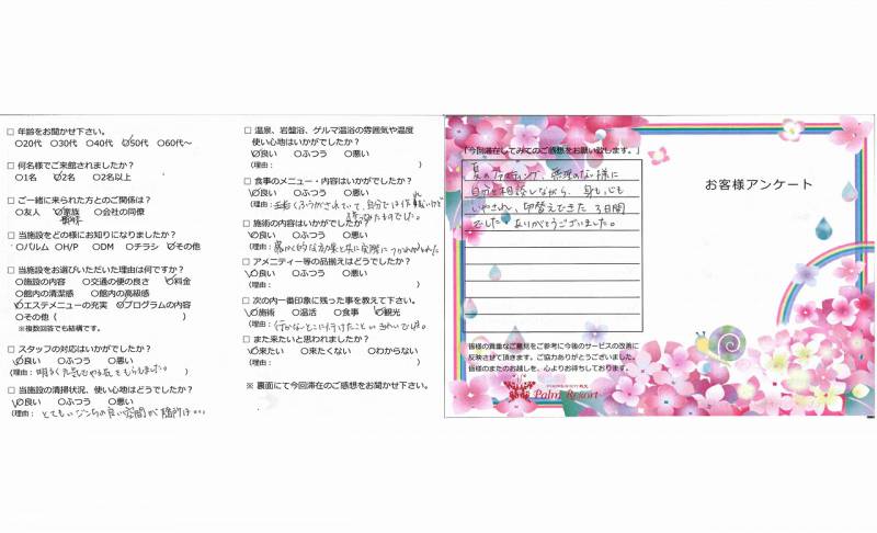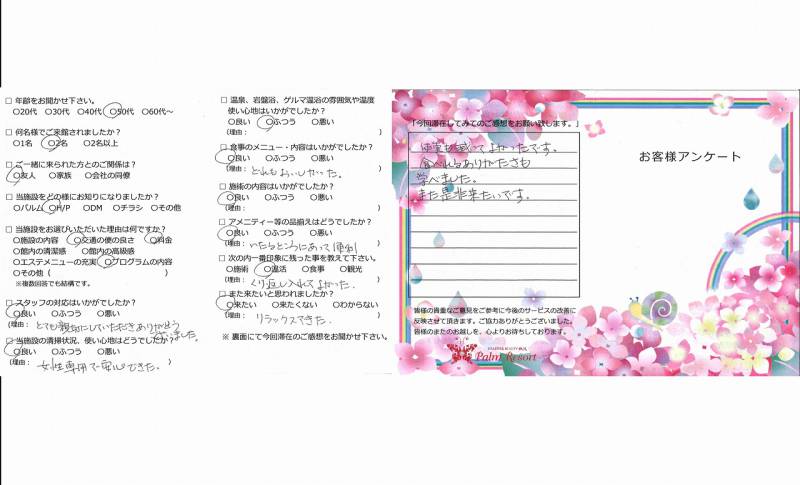 ほたるを見ることができ、32番にも お参りすることができ、大変満足です。 食事を制限することは私自身の身体に 合っていると思います。普段の生活に 活かしていきたいと思います。 控えめでゆるぎのないおもてなしに 感謝します。