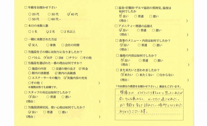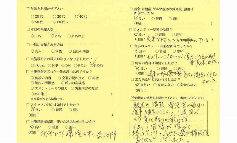 小尾先生 初めてのプチファスティングでしたが、とても楽しく、先生はじめスタッフの方々も親切で、大変気持ち良く二泊三日を過ごすことができました。 お母様の丁寧で心のこもったお食事は大変美味しく、最終日の鯉料理は薄味とのことでしたが濃く感じ、味覚の変化に皆でびっくりでした。 温泉で肌がスベスベになり、ゲルマや岩盤浴でデトックスしたり、イベントも沢山あり、空腹を感じる暇がほとんどありませんでした。 1人参加でしたが、パルムリゾートは女性だけで気兼ねがないこと、皆コースが同じなので、目標に向かって気持ちを1つに、自然と一体感が生まれたのが良かったです。 途中、好転反応か?頭痛がありましたが(元々肩こりと眼精疲労が酷く、一度頭痛が起きると鎮静剤を飲まないと治りません)ゲルマで発汗後ピタリと治まったのが不思議でした。(その節はご心配をおかけしました) 気持ちよく過ごせて、身体の内側も綺麗になり、更に減量できるなんて、一石三鳥、四鳥ですね。 またぜひ伺いたいと思います。