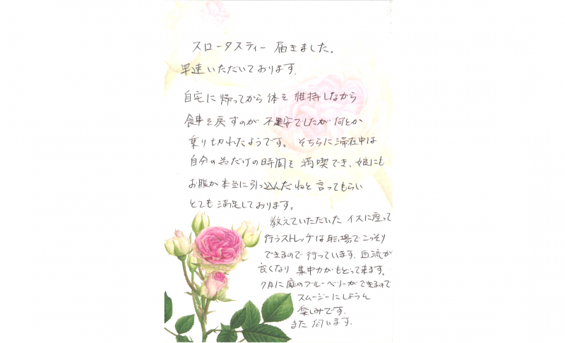 スロータスティー届きました。早速いただいております。 自宅に帰ってから体を維持しながら食事を戻すのが不安でしたが何とか乗り切れたようです。 そちらに滞在中は自分の為だけの時間を満喫でき、娘にもお腹が本当に引っ込んだねと言ってもらい満足しております。 教えていただいたイスに座って行うストレッチは職場でこっそりできるので行っています。 血流が良くなり集中力が戻って来ます。 7月に庭のブルーベリーができるのでスムージーにしようと楽しみです。また伺います。