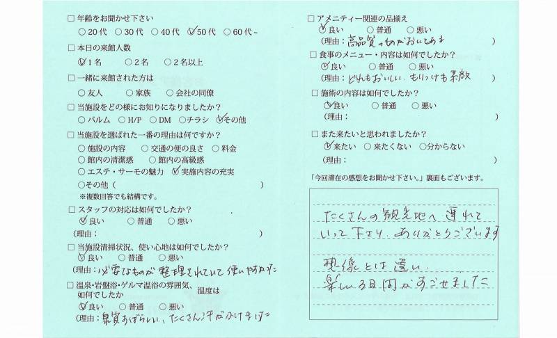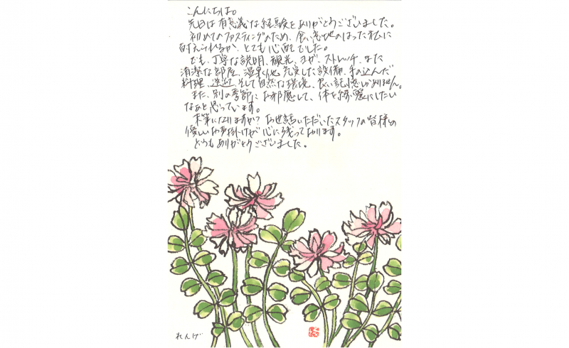 こんにちは。 先日は有意義な経験をありがとうございました。 初めてのファスティングのため、食い意地のはった私に耐えられるかとても心配でした。 でも、丁寧な説明、観光、ヨガ、ストレッチ、また清潔な部屋、温泉他、充実した設備、手の込んだ料理、送迎、そして自然な環境、良い記憶しかありません。 また別の季節にお邪魔して、体を綺麗にしたいなぁと思っています。 末筆になりますがお世話いただいたスタッフの皆様の優しいお声掛けが心に残っております。 どうもありがとうございました。