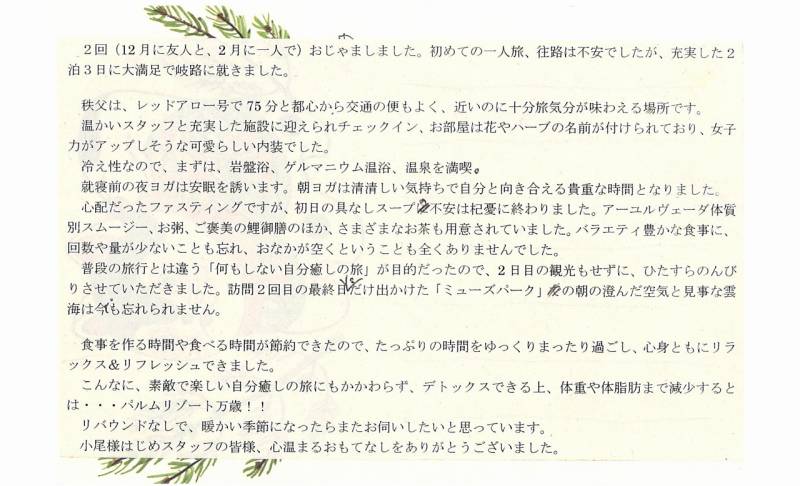 2回(12月に友人と、2月に一人で)おじゃましました。初めての一人旅、往路は不安でしたが、充実した2泊3日に大満足で帰路に就きました。 秩父は、レッドアロー号で75分と都心から交通の便もよく、近いのに十分旅気分が味わえる場所です。温かいスタッフと充実した施設に迎えられチェックイン、お部屋は花やハーブの名前が付けられており、女子力がアップしそうな可愛らしい内装でした。 冷え性なので、まずは、岩盤浴、ゲルマニウム温浴、温泉を満喫。 就寝前の夜ヨガは安眠を誘います。朝ヨガは清清しい気持ちで自分と向き合える貴重な時間となりました。心配だったファスティングですが、初日の具なしスープの不安は杞憂に終わりました。 アーユルヴェーダ体質別スムージー、お粥、ご褒美の鯉御膳のほか、さまざまなお茶も用意されていました。バラエティ豊かな食事に、回数や量が少ないことも忘れ、おなかが空くということも全くありませんでした。 普段の旅行とは違う「何もしない自分癒しの旅」が目的だったので、2日目の観光もせずに、ひたすらのんびりさせていただきました。訪問2回目の最終日にだけ出かけた「ミューズパーク」の朝の澄んだ空気と見事な雲海は今でも忘れられません。 食事を作る時間や食べる時間が節約できたので、たっぷりの時間をゆっくりまったり過ごし、心身ともにリラックス&リフレッシュできました。こんなに、素敵で楽しい自分癒しの旅にもかかわらず、デトックスできる上、体重や体脂肪まで現象するとは・・・パルムリゾート万歳!! リバウンドなしで、暖かい季節になったらまたお伺いしたいと思っています。小尾様はじめスタッフの皆様、心温まるおもてなしをありがとうございました。