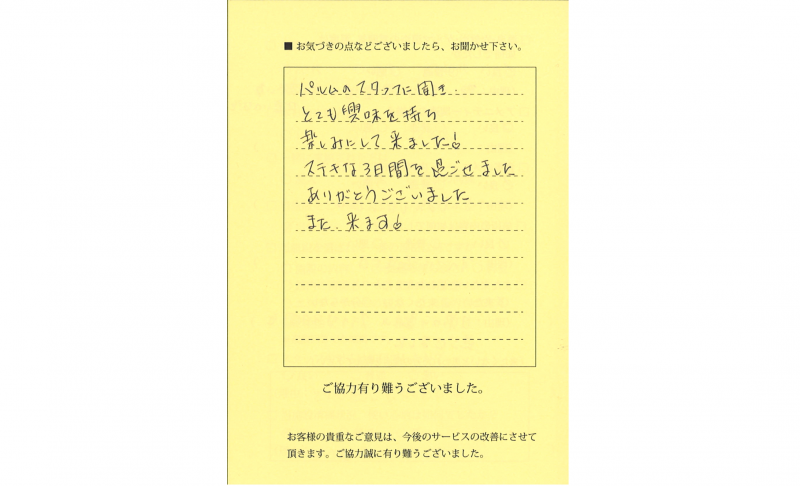 インテリアのセンス、館内の雰囲気、エステ、食事、観光すべて素晴らしかったです! 体重も落とすことができありがとうございました。また次回お邪魔できるのを楽しみにしております! 先生はじめスタッフの皆様ありがとうございました。