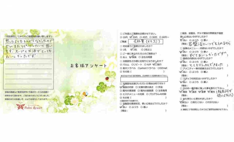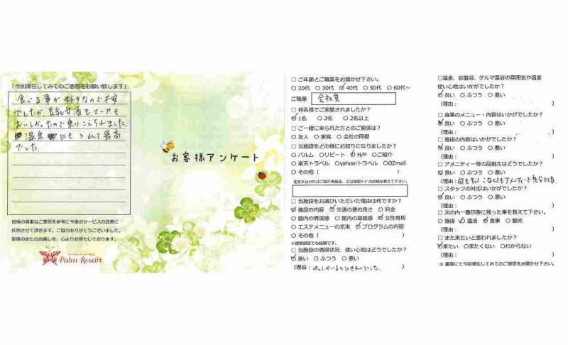 優海香オーナー、まりさん、パルムのスタッフの皆様 今回も、エステ、お食事、その他どれを取っても愛情 たっぷりの充実した超満足の2泊3日のファスティング をありがとうございました。 心も身体もすっかりデトックスできて次回来れるのを 心から楽しみに明日から又健康に気を付けて元気に 過ごせそうです。 肥満体系から脱出でき、普通サイズの洋服が着れる ようになったのもパルムさんのお陰です。 本当にありがとうございます。心から感謝を込めて