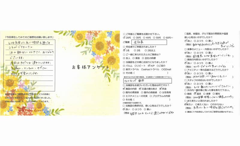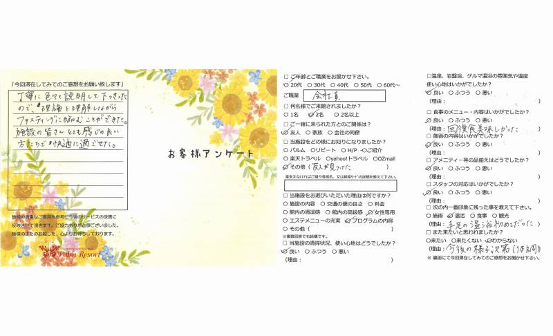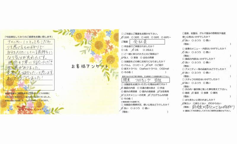 アメニティ―1つとってもこだわりを 感じる物ばかりで、自分を大切にして いる気持になり気分が良かったです。 施術も丁寧に対応いただき安心感が ありました。友達にも紹介したいと 思います。ありがとうございました!