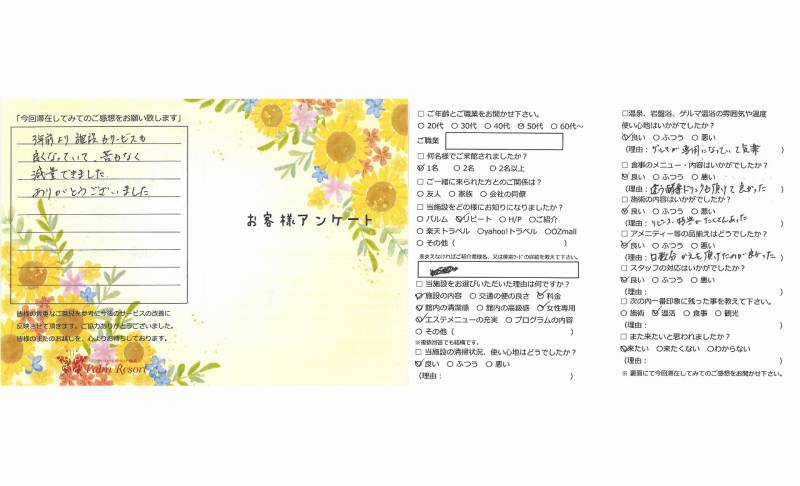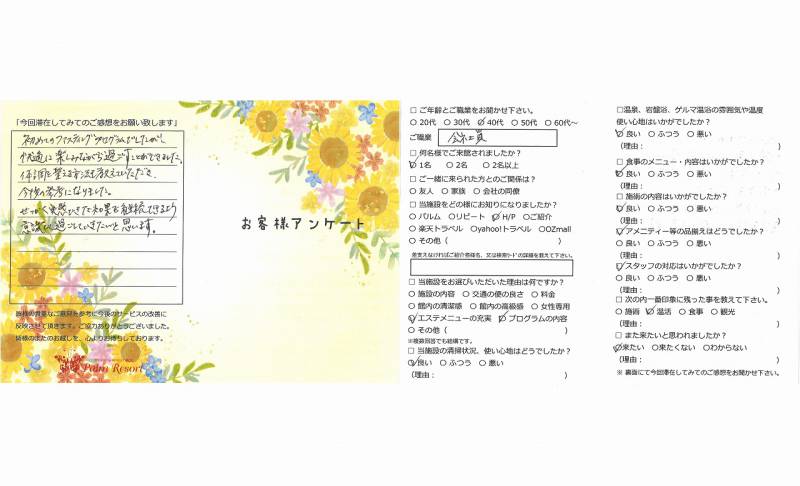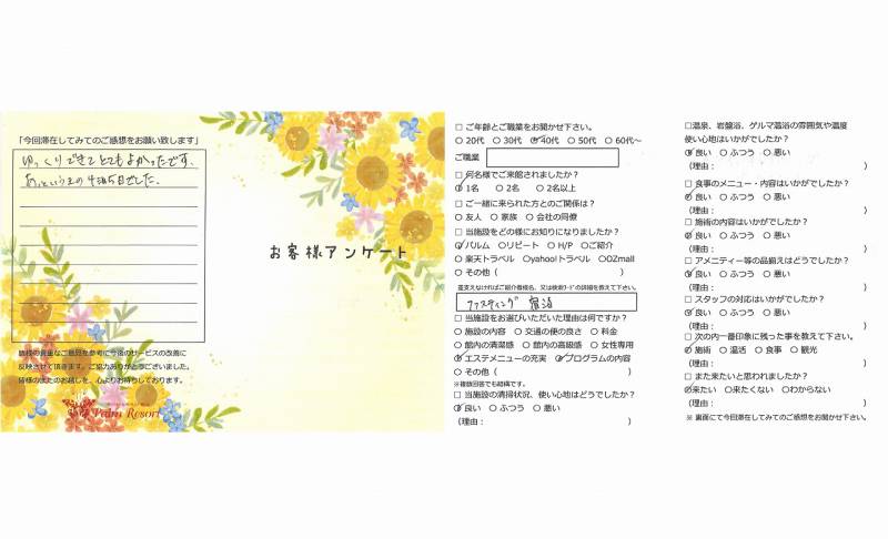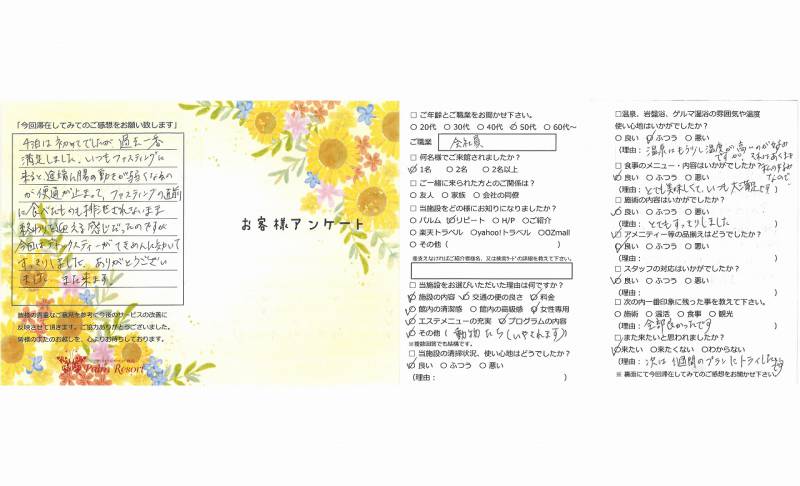 3年前より施設もサービスも良く なっていて苦もなく減量出来ました。 ありがとうございました。