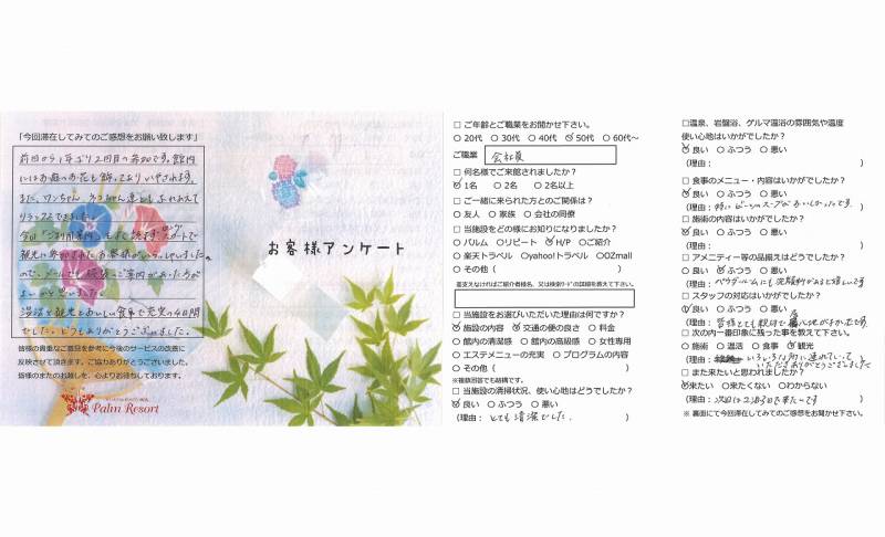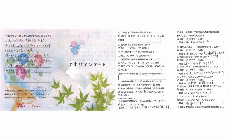 いつもこちらに来ると本当にリラックスして 心身共に元気になり帰る事ができます。 どうもありがとうございます。最後の日に フレッシュジュース頂き、体に染み渡るのが わかりとても美味しかったです。これからも リピーターとして来させて頂けたらと思います。