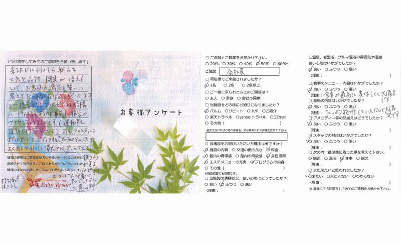 来るたびに何かしら新たな工夫や品物、機具が増えて いて、お客様の満足を第一に考えておられるんだなあ と感心します。 2つ提案があり!アクティビティは結構ハードな時も あるので事前に服装のアナウンスが欲しいです。 (運動靴、運動ができる服装など)あとアメニティは ボディスポンジをボディタオル(ホテルのアメニティ でよくあるやつ)にして滞在中はずっとそれを使う ようにするなどするとエコな印象をアップしてよいと 思います。持ち帰って使えるし