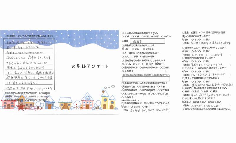 初めての断食で不安でしたが、わかりやすく丁寧な 説明と体調を考えられたおいしい食事、充実した 飲み物があり、安心して取り組めました。 体調を崩すことなく出来て本当に良かったです。 温活施設も清潔で利用しやすく、じんわり汗をかき 体が温まりとても良かったです。エステもすごく 気持ち良かったので、大満足な滞在になりました。 ありがとうございました。