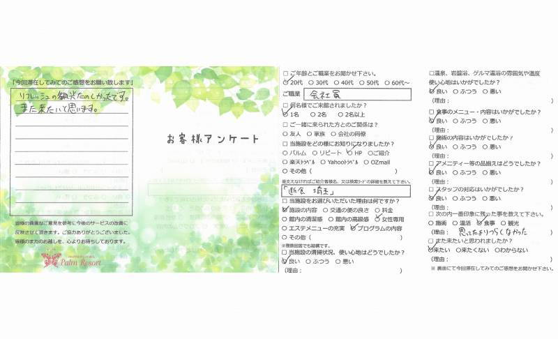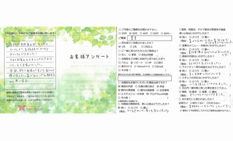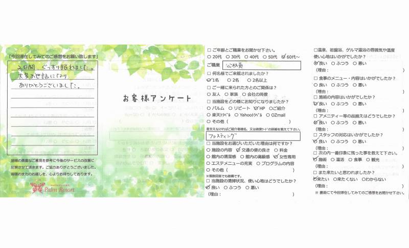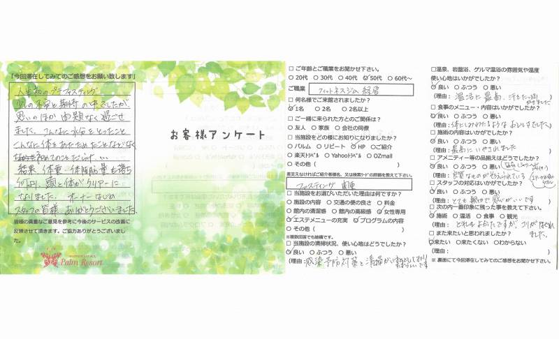 人生初のプチファスティング少しの不安と期待の 中でしたが思いのほか問題なく過ごせました。 こんなに水分を摂った事こんなに体をあたためた ことなどなく初めての事だらけ… 結果、体重・体脂肪量も落ち何より頭と体がクリアー になりました。オーナーをはじめスタッフのみなさま ありがとうございました。