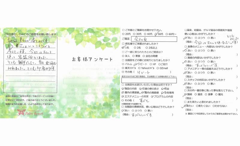 毎回来るのが楽しみです。 もう次はいつ来ようかと考えています。 今回はオイルを使って岩盤浴をしました。 とても新鮮でした。朝、雲海も見れました。 とても印象的です。