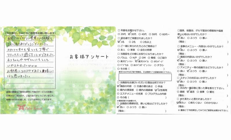 自宅ではできない貴重な体験をさせて頂き ありがとうございました。 スタッフの方々も皆とても丁寧でリラックス して過ごす事ができました。 ネコちゃんやヤギさんにもとても癒されました♡ お部屋にコロコロがあると嬉しいなと思いました。