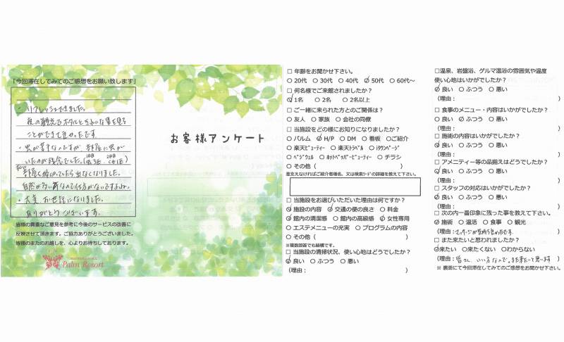 ファスティングに興味はあるものの、自宅でできる オンラインのものと直前までずっと悩んでいたので すが、思い切って来て本当に良かったです‼ 意志が弱い私でも3日間やりとげる事ができました。 コロナで大変な状況の中、対策を徹底されていて 感謝しかありません。 ホタルも良い思い出になりました。また来たいです。 ありがとうございました‼