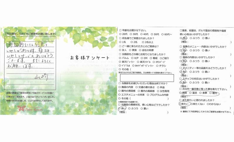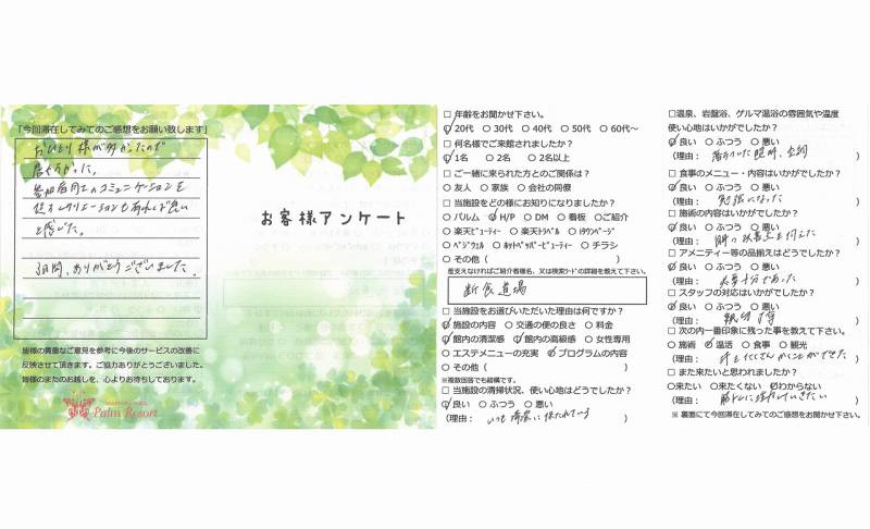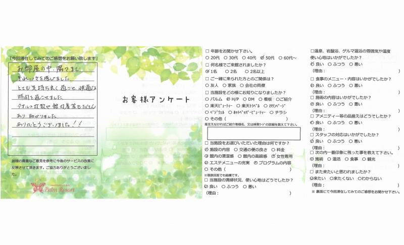 固形物を食べないということはそれほど苦痛では ありませんでした。適度にほったらかしてもらえるのも 心地よかったです。温浴が色々あるので、スリッパは タオル地の使い捨てのものもあるとよりいいかなと思い ました。ありがとうございました。