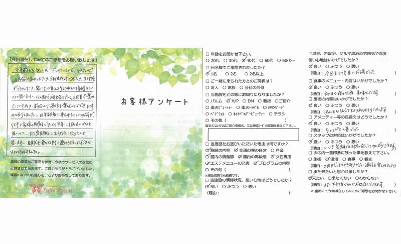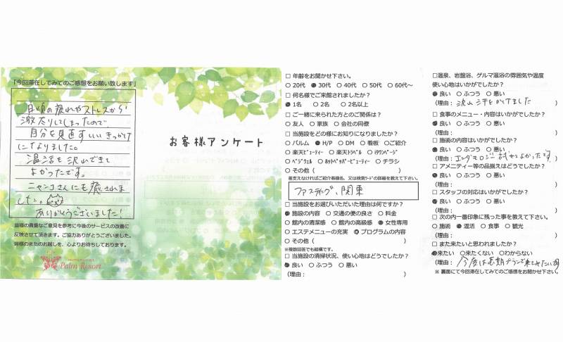 2泊3日でしたが、温浴、エステ、ファスティングで 体がリフレッシュされたのを実感しています。 スタッフの皆さまには大変お世話になりました。 ありがとうございました。