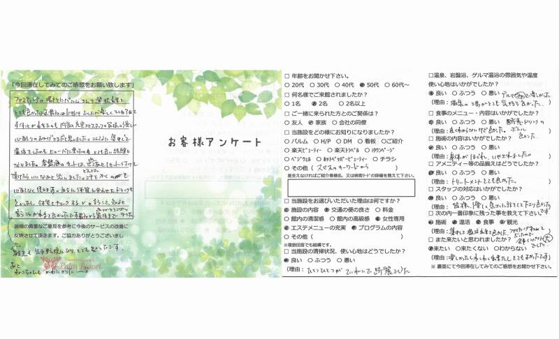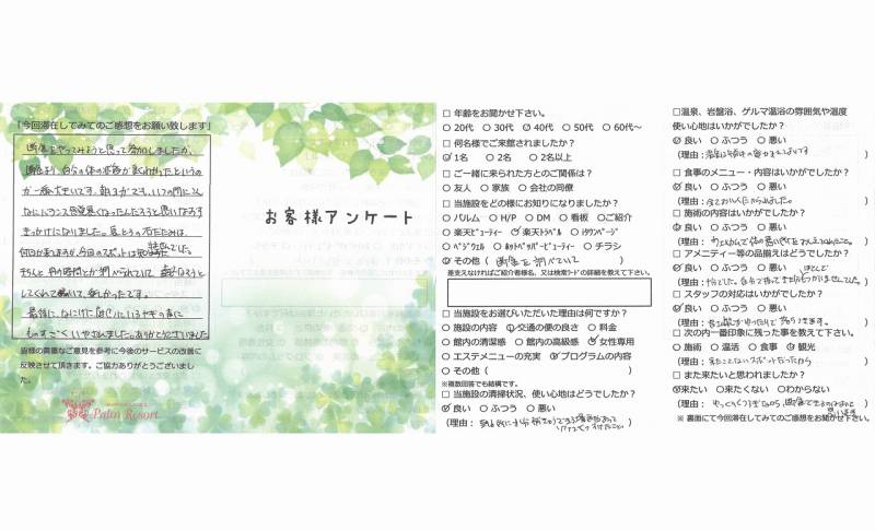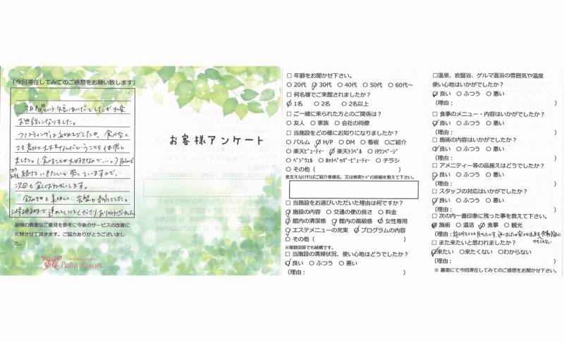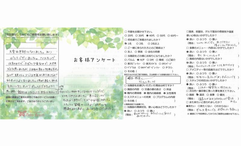 ファスティングの場所にパルムさんを選択出来てとても 良かったです。最初はドキドキでしたが楽しく2泊3日を 過ごす事が出来たのも、内容の充実さとスタッフ皆様の 優しい心配りのおかげさまだと思いました。 こんなに集中して温活をしたのも、ヒューバーに乗った のも、とても良い経験となりました。 岩盤浴のセットは、せめてあと1セットつけて頂けたら いいなあと思いました。どんどん汗をかくのも心配なく 使えます。自分の体質に合わせたドリンクも良かったし 体質をチェックするという事、知るという事が出来て良 かったです。最初から最後までありがとうございました。 観光も気分転換になりとっても良かったです。 あとねこちゃんもかわいかったー!