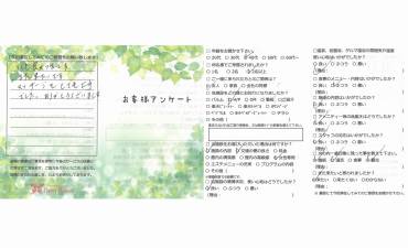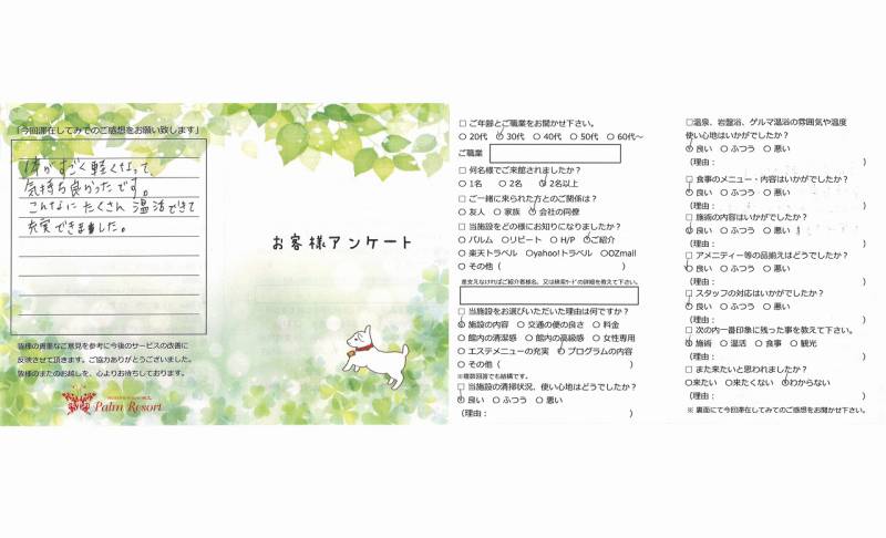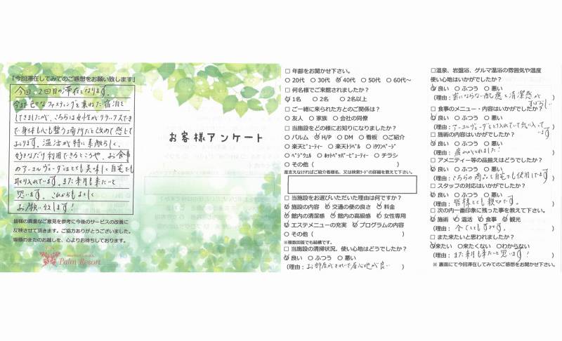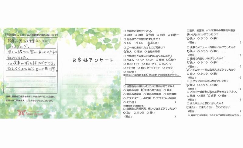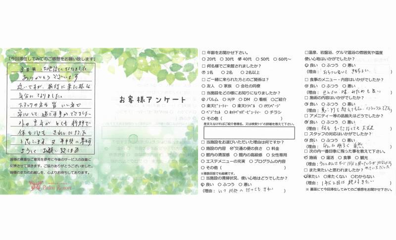 3日間お世話になりました。ありがとうございます。 近いですが、旅行に来たような気分になりました。 スタッフの方も皆いい方で安心して過ごす事が できました。外の空気がとても新鮮で体も心も きれいになったと思います。又、半年後に来ます。 よろしくお願い致します。