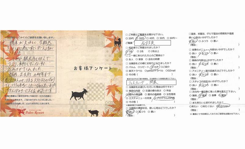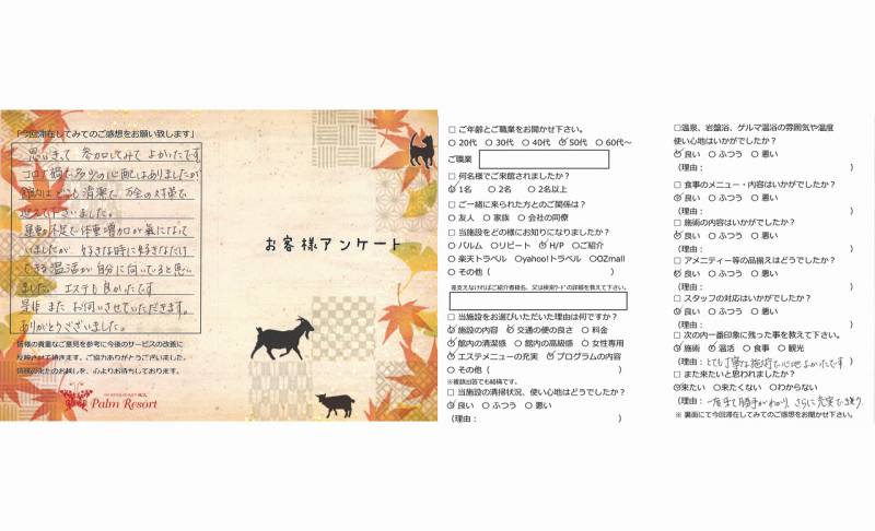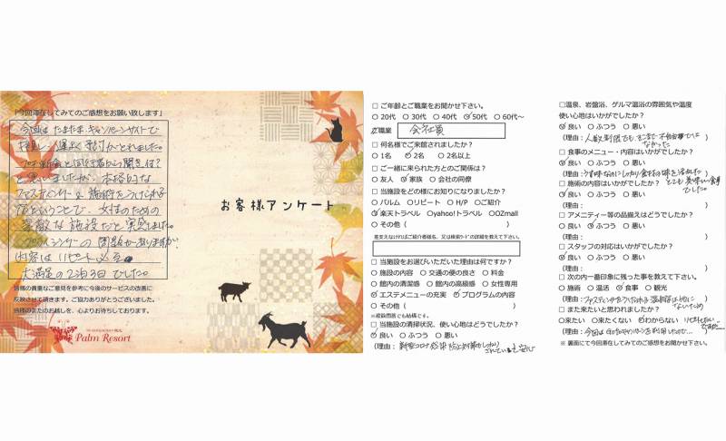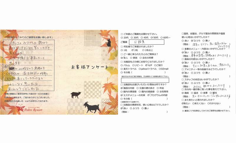スタッフのみなさんが親切で適切な アドバイス等をいただき満足でした。 今度日帰りで来店したいと思います。 消灯が22時なので無理かもしれませんが 温活施設の時間をもう少し長くしていた だけるとうれしいなと思いました。 ありがとうございました。