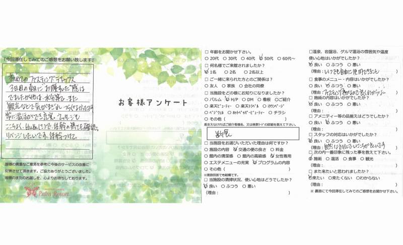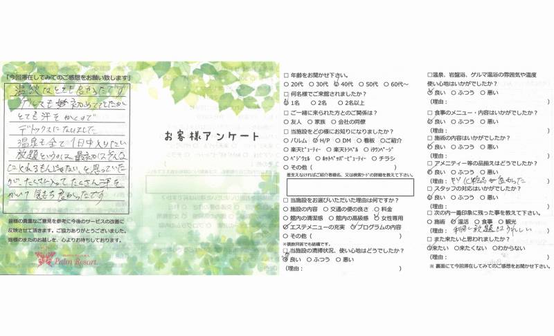 温浴はとても良かったです。ゲルマも初めてでしたが とても汗をかくのでデトックスになりました。 温泉も全て1日中入りたい放題というのは、最初は そんなに入れるもんじゃないと思っていたが、たくさん 入ってたくさん汗をかいて気もち良かったです。