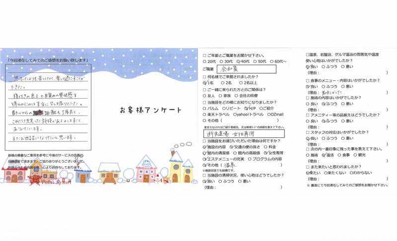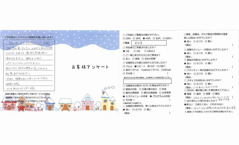 思っていたよりも苦しくなく、楽しく過ごすことが できた。寝付きの良さと目覚めの爽快感を得られた のは本当に久し振りだった。都心からの距離も丁度 良く、これだけ充実した施設があるのはすごくあり がたいです。またお世話になりたいと思います。