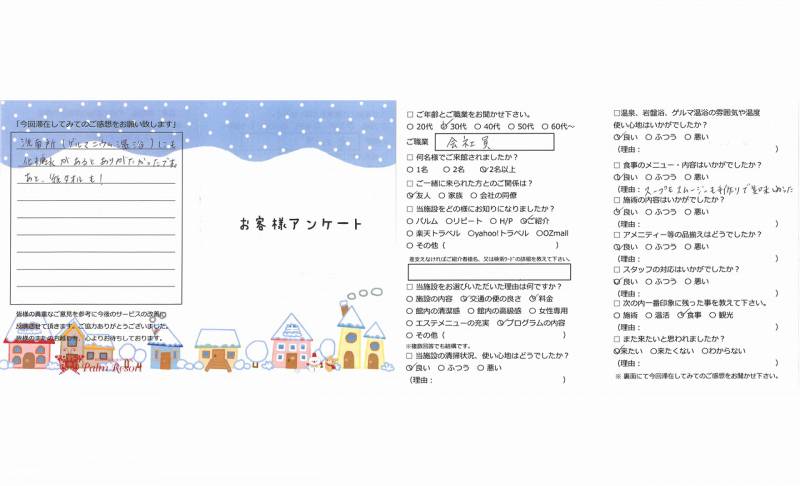 2年間で30kg太ってしまい、自己流では限界があり ワラにもすがる思いで参りました。今回の滞在で減量 する目標をしっかりと持てたのも、小尾先生が的確に アドバイスしていただいたからです。長期戦になりそう ですが、これからも頑張れそうです。単に温活、エステ ファスティングでも充充に満足できますが、パルムは 食生活、ライフスタイルを見直すことから体感できます。 また観光で三峯神社に行けて、更にパワーをもらいました。 ありがとうございました。