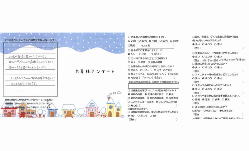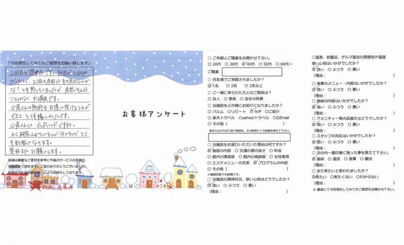 忘年会続きで疲れた体を休める為に来ましたが 温泉などの温活と体に優しい食事、マッサージ ふくちゃんのお陰で体(特に胃腸)が元気に なりました。今回は初めてで、温活をこなすので 精一杯でしたが、次回はマッサージもお願いしたい と思います。ありがとうございました。