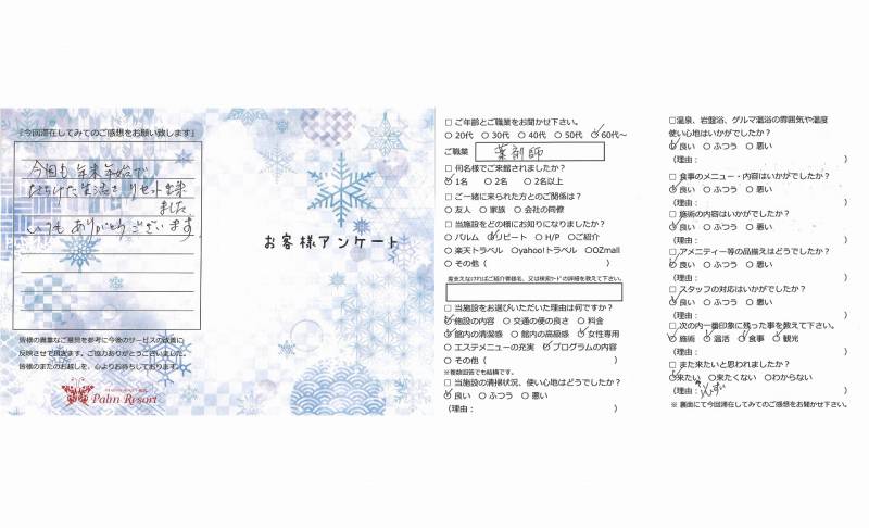 今回もとても充実した一時でした。 色々とお気遣い頂いてありがとうございました。 体調も良くなって、体も軽くなりました。 ありがとうございます。又、来ます♡