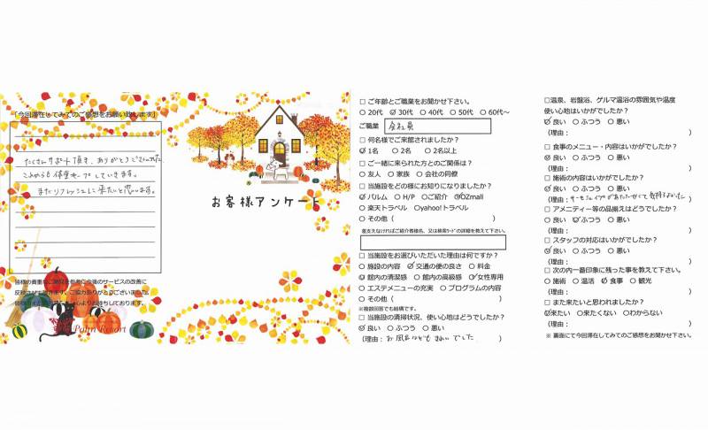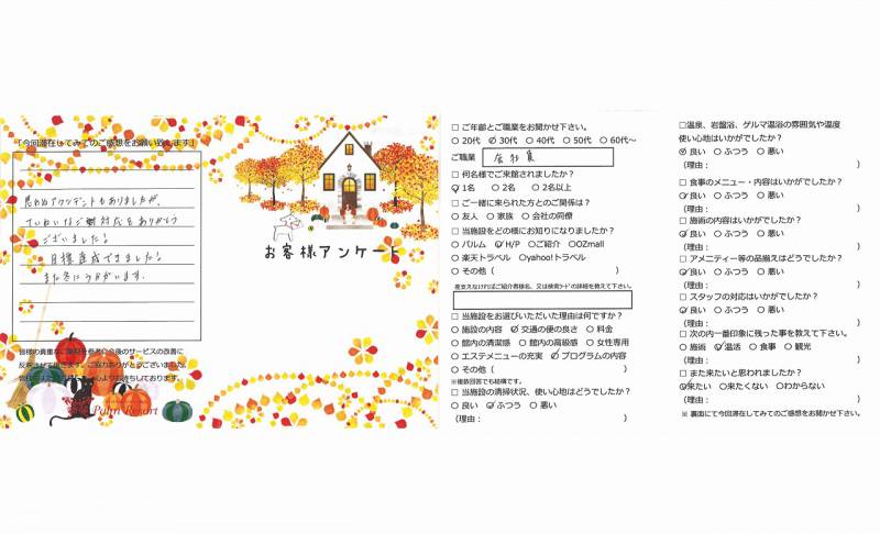 すごく充実してゆっくりできた3日間でした。もう 少し自分としては体重を落としたかったのですが 戻ってからの生活を心がけるというアドバイスの とおり、頑張っていきたいと思います。 ファミリー経営でアットホームで居心地がよくて 体だけでなくて心もすっきりしました! ありがとうございました^_^