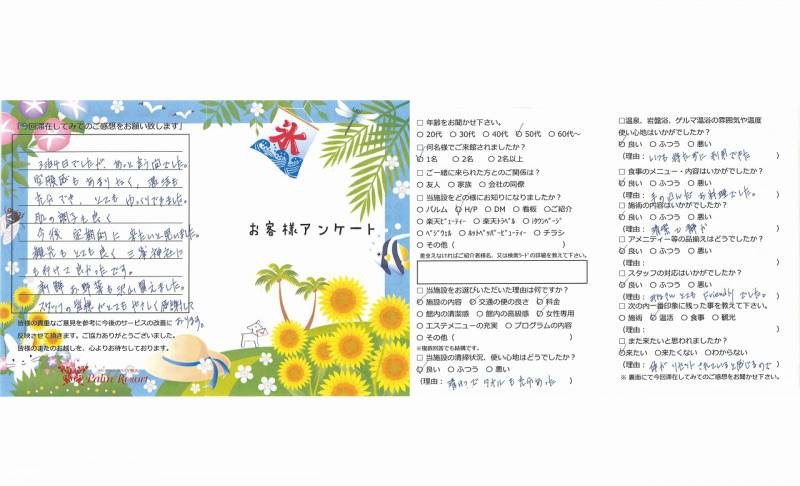 3泊4日でしたが、あっという間でした。空腹感もあまり なく、温活も充分でき、とてもゆっくりできました。 肌の調子も良く、今後定期的に来たいと思いました。 観光もとても良く三峯神社にも行けて良かったです。 新鮮お野菜も沢山買えました。スタッフの皆様がとても やさしく感謝しております。