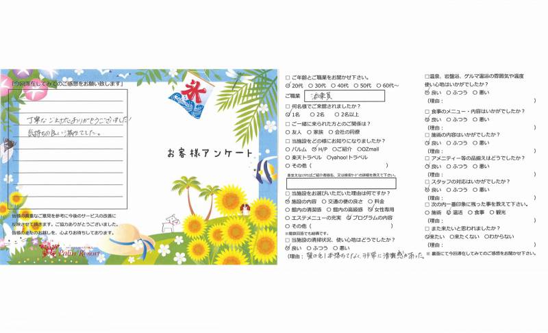 秩父まで交通の便が良くそこにファスティングができる パルムリゾートがあるのはとても便利だと思いました。 お部屋や設備もきれいで使いやすかったです。 2泊でファスティング体が変わり今後の食生活でも気を つけていく点が分かり活かしていきたいです。 スタッフの皆さんがとてもあたたかくて安心しました。 ありがとうございました! 寝る前の体操は筋トレよりストレッチでそのアトボーッと するめいそう?時間みたいなのを少しいれて頂けると眠りに つきやすいと思いました。
