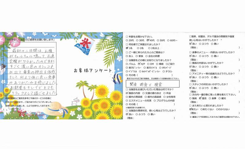 最初の二日間は、お腹がキュルキュル鳴って、正直 空腹がツラかったのですがすごく濃い色のオシッコ が出て毒素の排出を体感。 そして何より体に良い食事のありがたみを感じました。 お部屋もキレイでとてもリラックスして過ごせました。