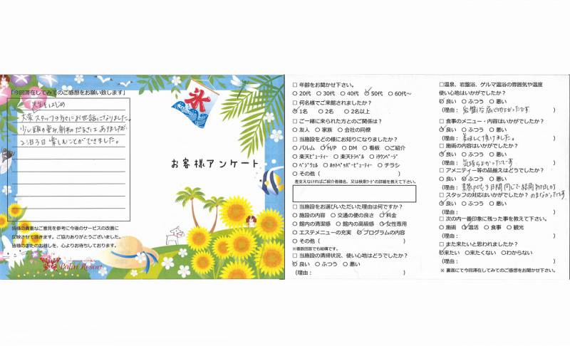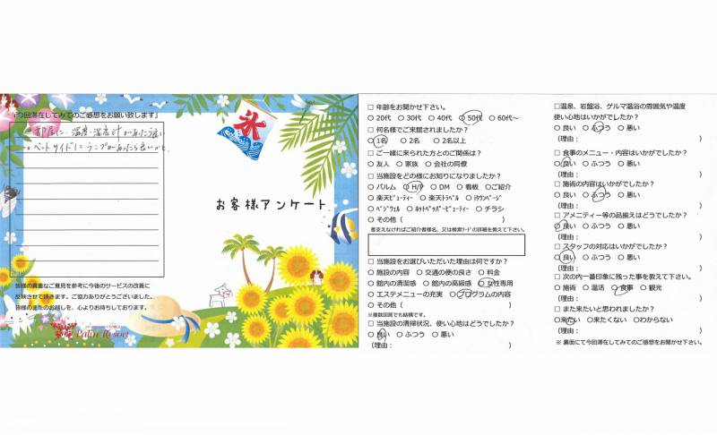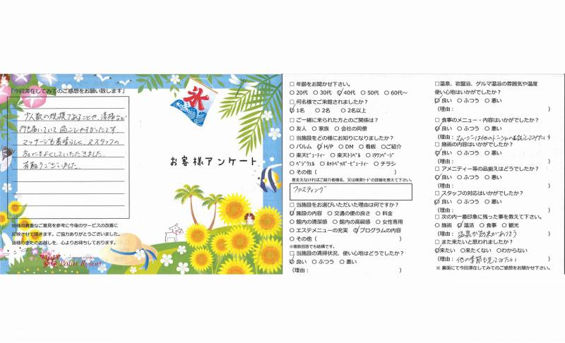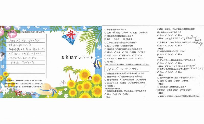 少人数の規模であることや、清掃など 行き届いていて過ごしやすかったです。 マッサージも素晴らしく、又スタッフ の方々にもよくしていただきました。 有難うございました。