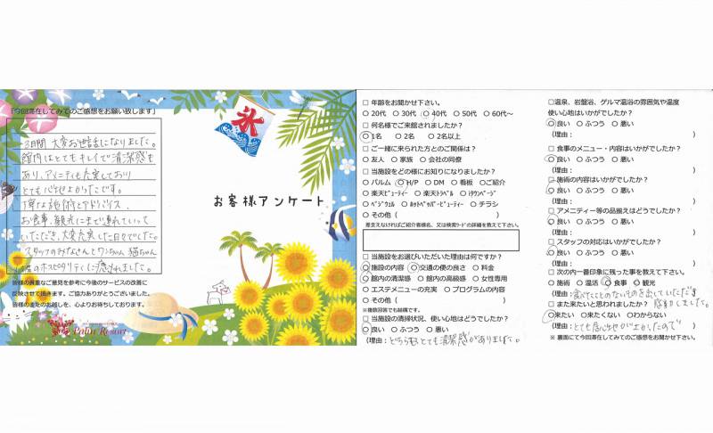 3日間大変お世話になりました。 館内はとてもキレイで清潔感もあり、アメニティも 充実しておりとても心地よかったです。 丁寧な施術とアドバイス、お食事、観光にまで連れ ていっていただき、大変充実した日々でした。 スタッフのみなさんとワンちゃん猫ちゃんメイ君の ホスピタリティに癒されました。