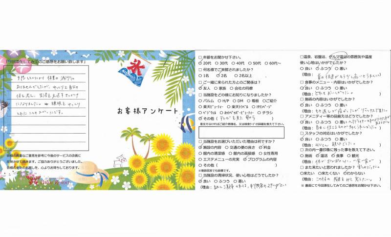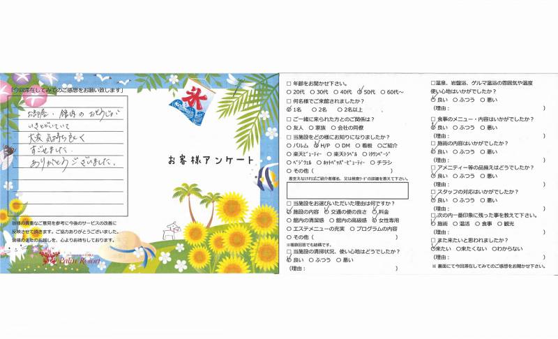 お部屋、館内のおそうじがいきとどいていて 大変気持ちよくすごせました。ありがとうございました。