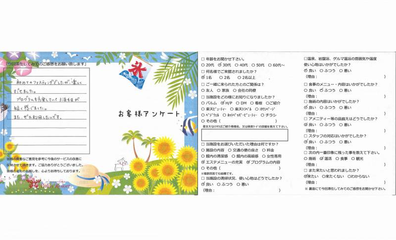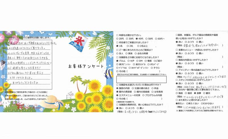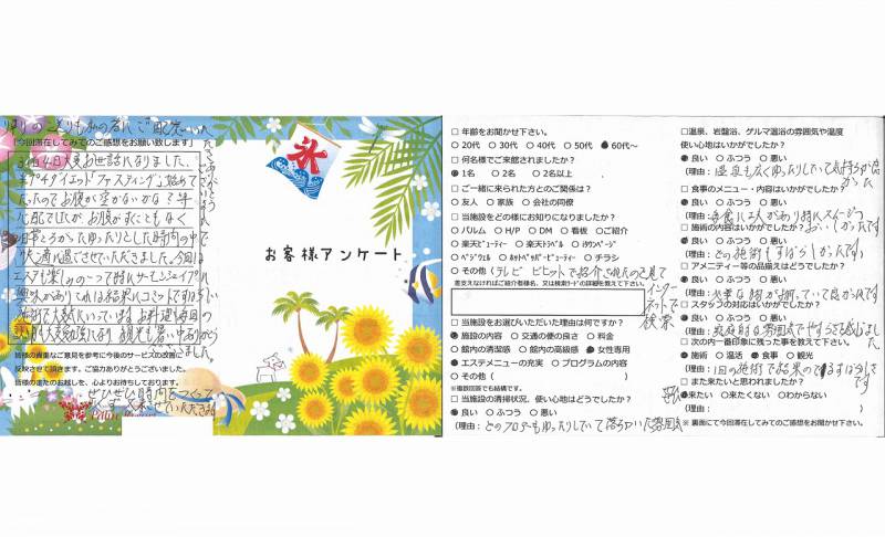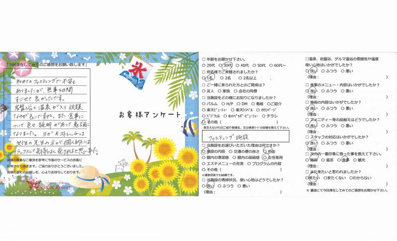 3泊4日大変お世話になりました。 半プチダイエット「ファスティング」初めて だったのでお腹が空かないかな?等心配でしたが お腹がすくこともなく日常とちがったゆったりと した時間の中で快適に過ごさせていただきました。 今回はエステも楽しみの一つで特にサーモシェイプに 興味がありこれは結果にコミットですばらしい施術で 大変気に入っています。 お料理も毎回の説明も大変勉強になり、観光も暑い中 ありがとうございました。ぜひぜひ時間をつくって 必ず又来させていただきます。帰りの送りも私のために ご配慮いただきありがとうございました。