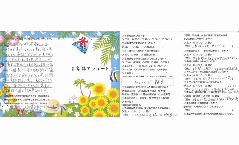 初めてのファスティングで不安もありましたが 無事3日間すごせてよかったです。 岩盤浴と温泉が入り放題なのが良いですね。 また食事について色々説明があって勉強になりました。 ヨガ&ストレッチは女性の先生の方が個人的には リラックスして気持ちよく受けれると思いました。