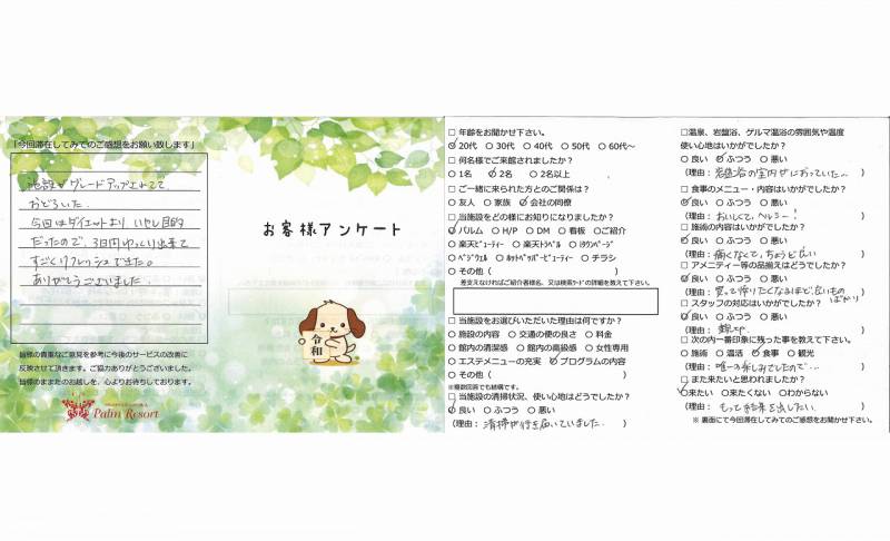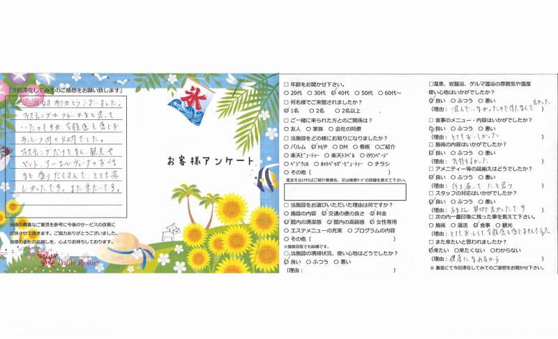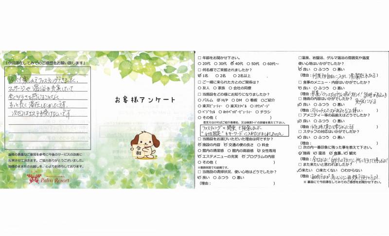 3泊4日ありがとうございました。ファスティングは つらいかなと思っていたのですが、空腹感を感じず あっという間の4日間でした。ファスティングだけで なく、観光やペットアーユルヴェーダのお話など盛り だくさんで、とても楽しかったです。また来たいです。