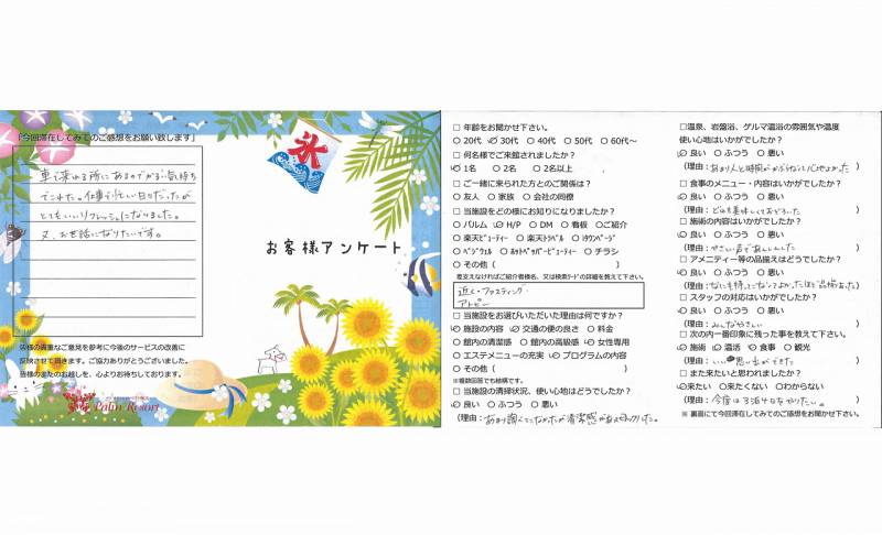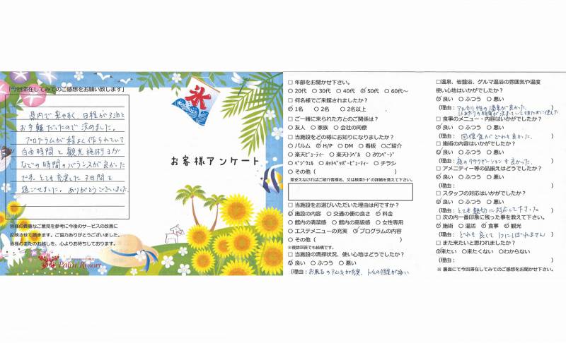 県内で来やすく、日程が3泊と お手軽だったので決めました。 プログラムが程よく作られていて 自由時間と観光、施術、ヨガなどの 時間のバランスが良かったです。 とても充実した3日間を過ごせました。 ありがとうございました。