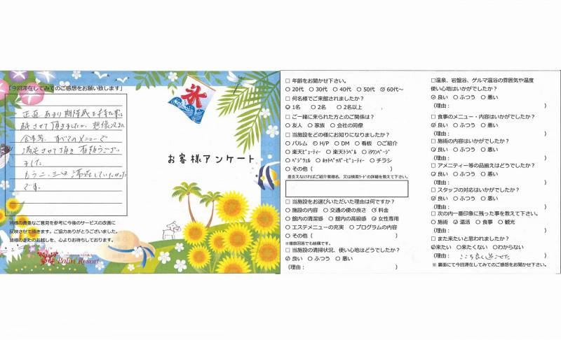 正直あまり期待感を持たずに来させて 頂きましたが、想像以上に食事等、全ての メニューで満足させて頂き有難うございました。 もう二、三日滞在していたかったです。