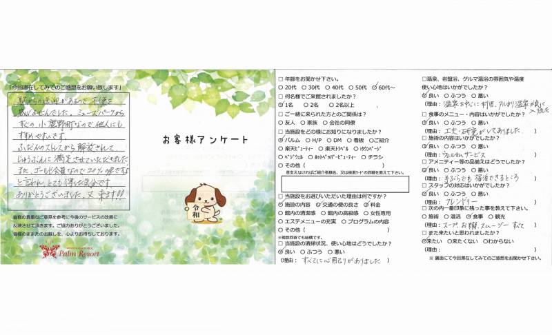 駅からの送迎があるので、不便を感じませんでした。 ミューズパークからすぐの小鹿野町なので、他人にも すすめやすいです。 ふだんのストレスから解放されてじゅうぶんに満足 させていただきました。 また、ゴールド会員なので20%offですよと言われ とても得した気分です。 ありがとうございました。又、来ます‼