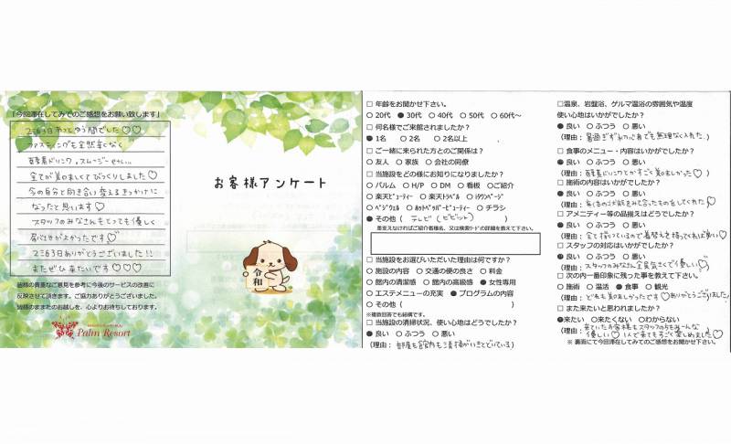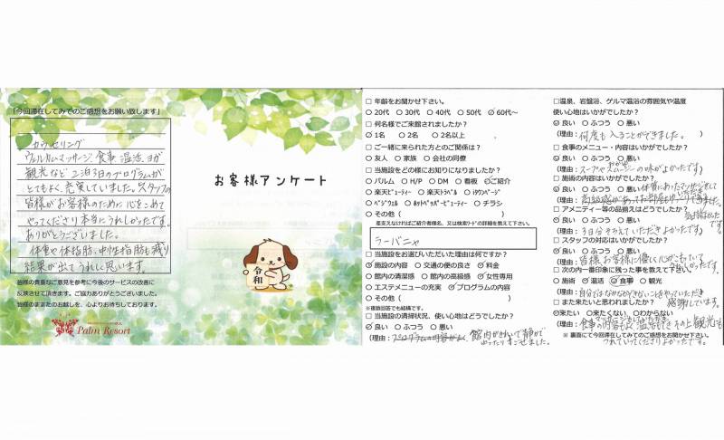 カウンセリング、ウエルカムマッサージ、食事 温活、ヨガ、観光など2泊3日のプログラムが とてもよく充実していました。 スタッフの皆様がお客様のために心をこめて やってくださり本当にうれしかったです。 ありがとうございました。 体重や体脂肪、中性脂肪も減り結果が出て うれしく思います。