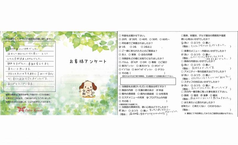 お風呂や温浴、岩盤浴など、どの施設も使い放題で タイミングよく利用させて頂きよかったです。 食事の事…これからはもう少し考えてみようと思い ました。晩のストレッチ、朝のヨガも、よりポイント がわかってよかったです。定期的にまた伺いたいです。 ありがとうございました。お世話になりました!