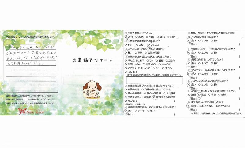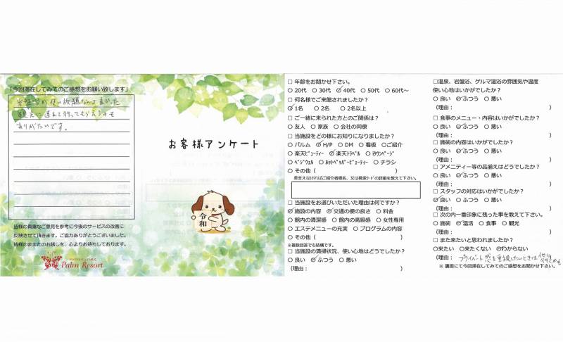 今回初めてファスティングに挑戦しましたが 思った程空腹感に苦しむことも無く、良かったです。 途中頭痛とダルさが出てしまい、ご心配をおかけして しまいましたが、スタッフの皆様に色々お気遣い頂き ありがとうございました。 短い間でしたが、美容と健康について改めて考える 良い機会となりました。 また滞在する際はよろしくお願い致します。